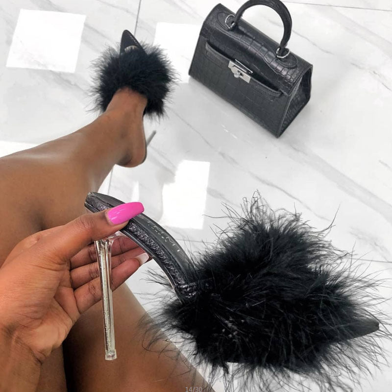 Experience the elegant style with our transparent crystal high heels, featuring soft fan fur. Perfect for special occasions or a glamorous evening. These shoes not only offer a striking look but also high comfort. Available in classic black, which pairs perfectly with any outfit. Choose your size now and add that extra touch to your attire! Size Information: